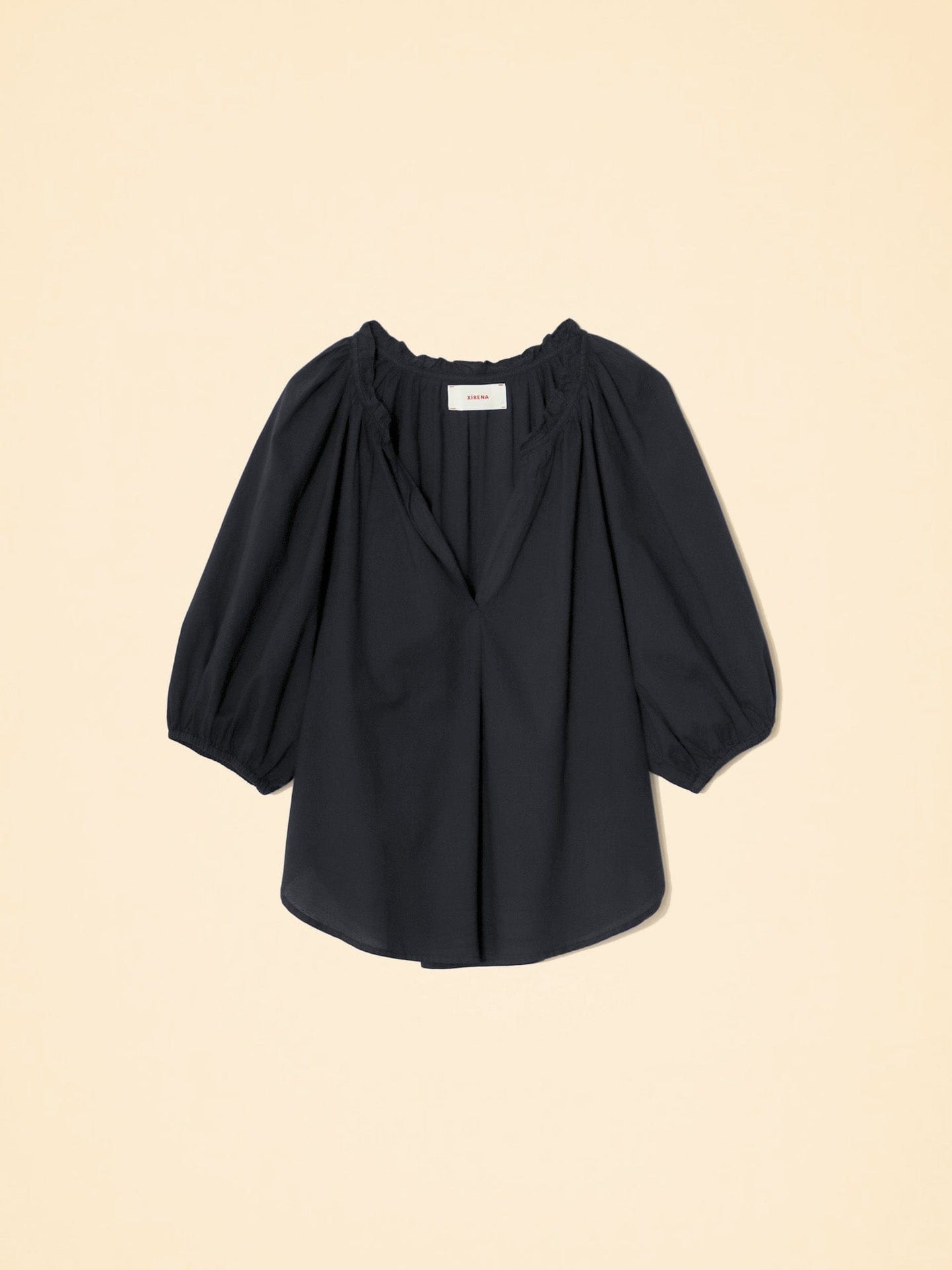 an easy popover with a ruffle neckline and bubble sleeves with an elastic cuff.