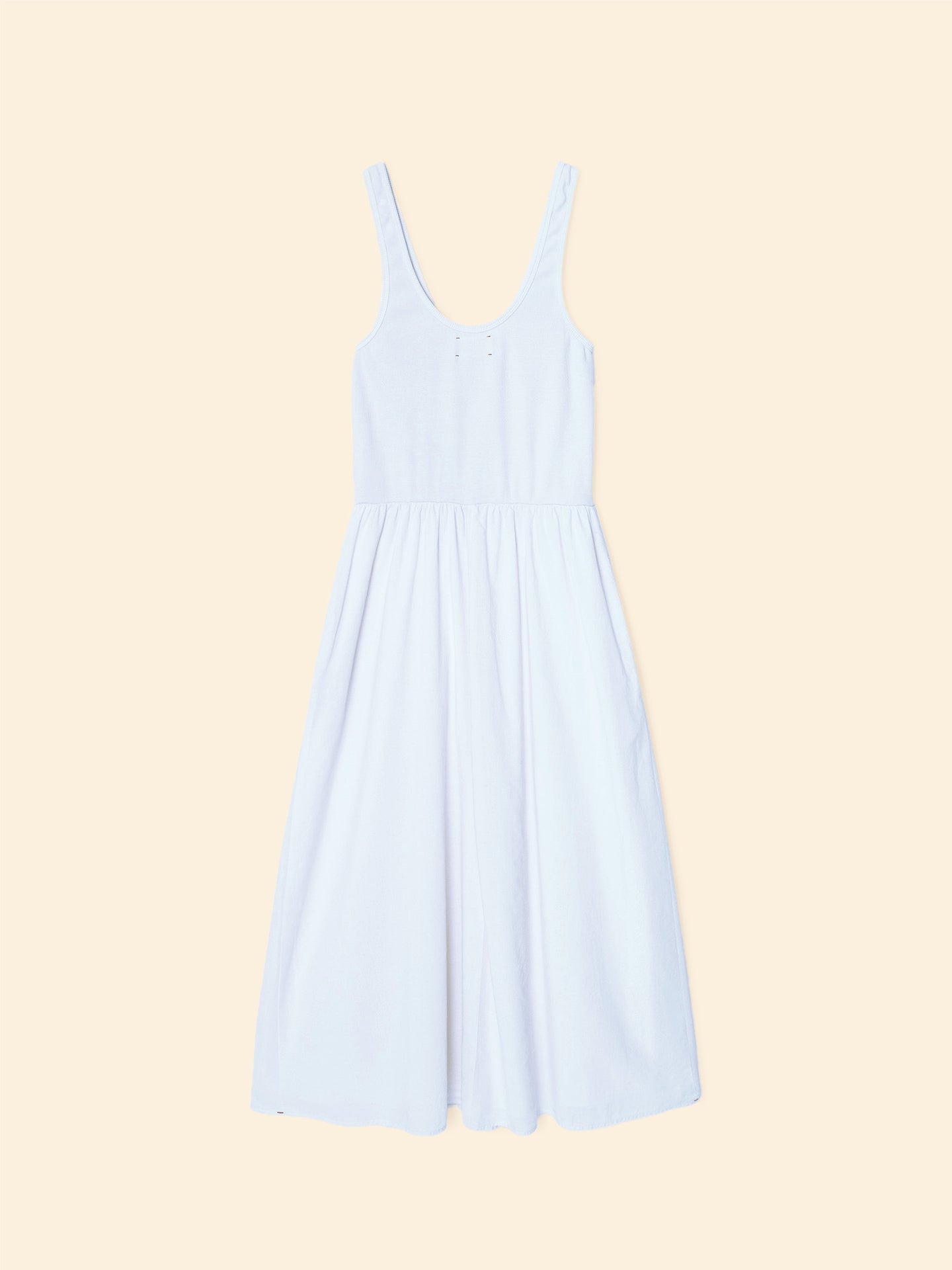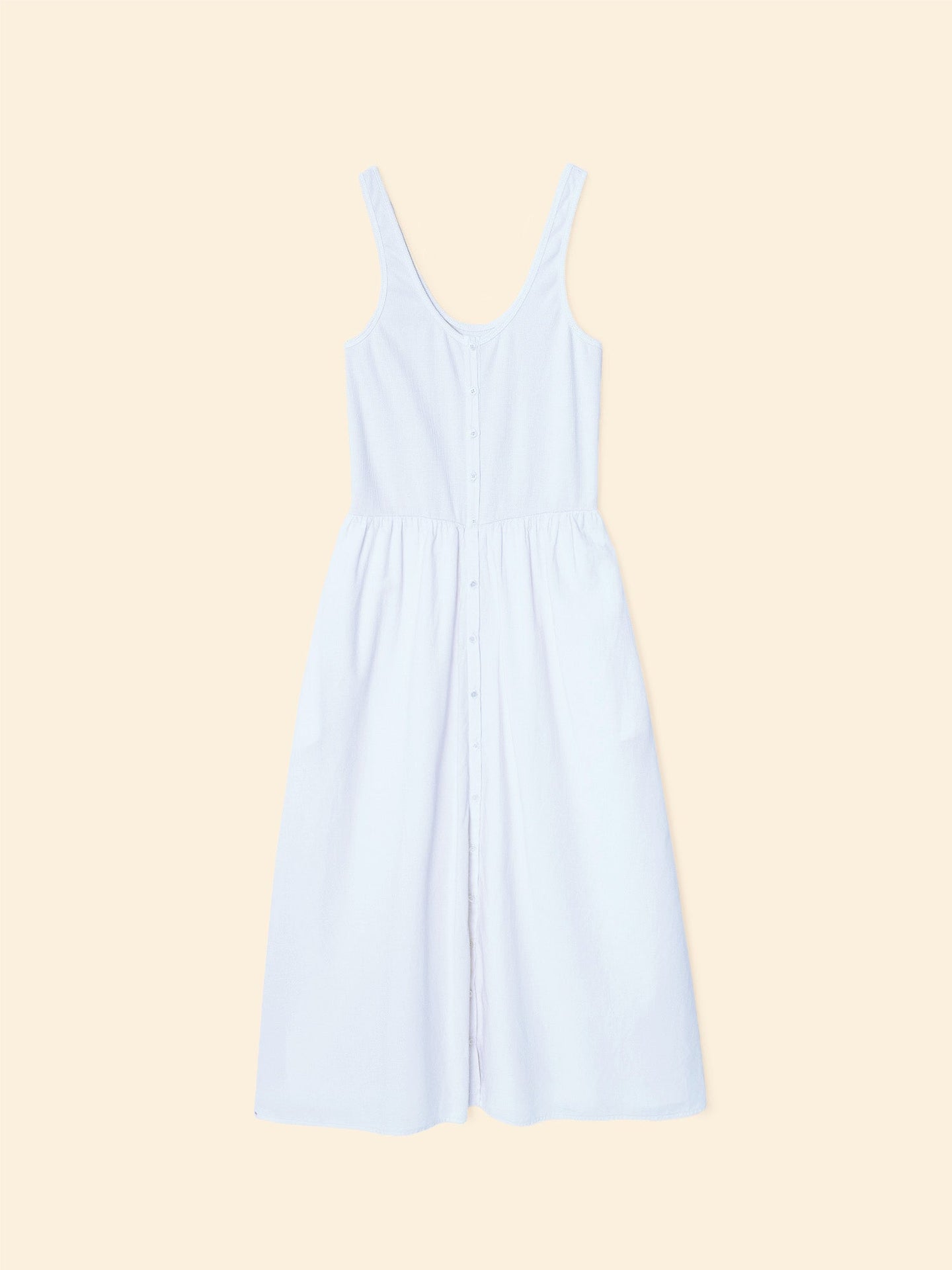 Best of Both Worlds. Fenix is new this season in our classic lightweight woven cotton poplin for a lived-in look and feel. This sleeveless maxi dress is fully lined and features a button-front, contrast cotton rib knit top, full skirt, and side seam pockets.